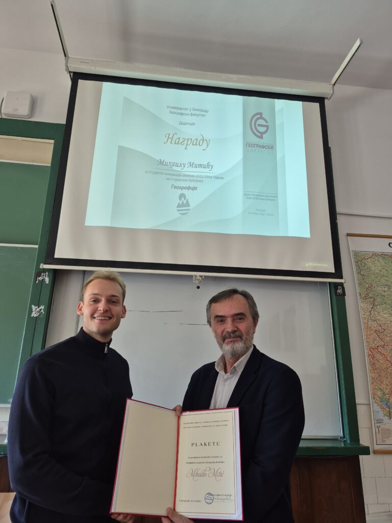 Dobitnik nagrade za školsku 2024/25. godinu, kao najbolji student studijskog programa Geografija, je Mihailo Mitić, koji je diplomirao sa prosečnom ocenom 9,76. Čestitamo!